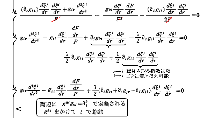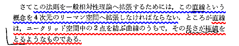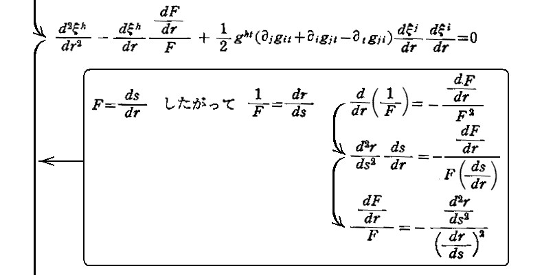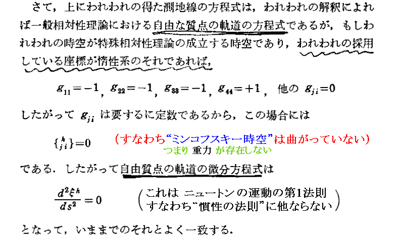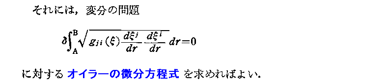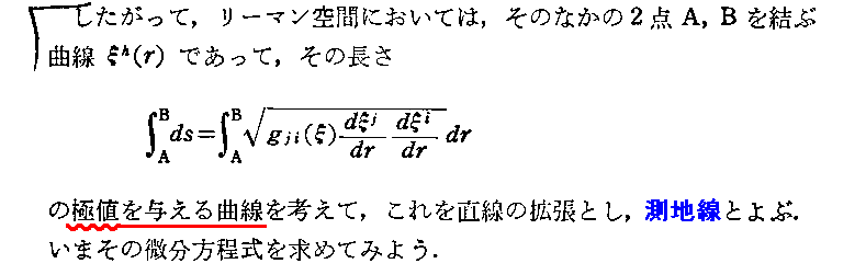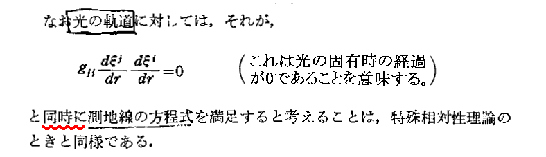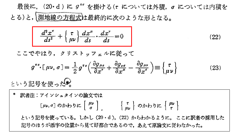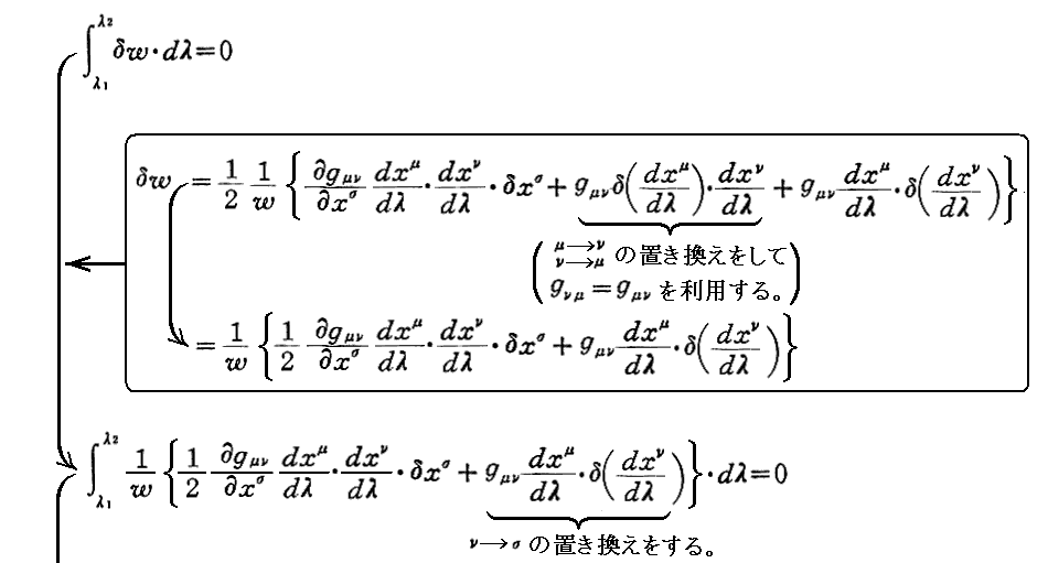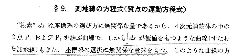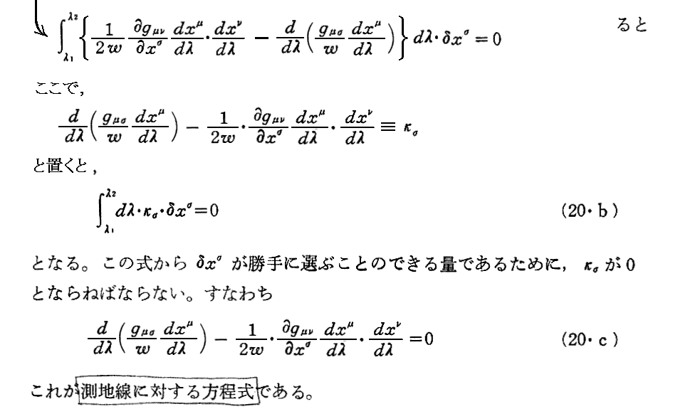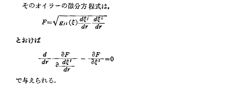 “測地線方程式”の導出について、Einsteinの1916年論文「一般相対性理論の基礎」§9(共立出版「アインシュタイン選集2」p79〜81)から引用しておきます。これは“オイラー方程式”(ラグランジュ方程式)の部分をすっ飛ばして直接測地線方程式を導いていますので極めて明快です。ただし、解りやすくする為に、行間を補って追記し少し改変しています。