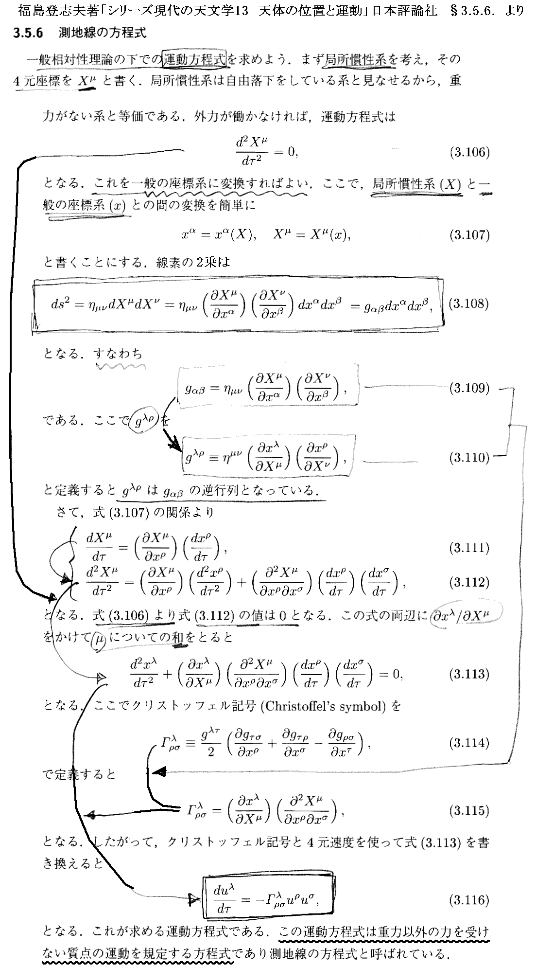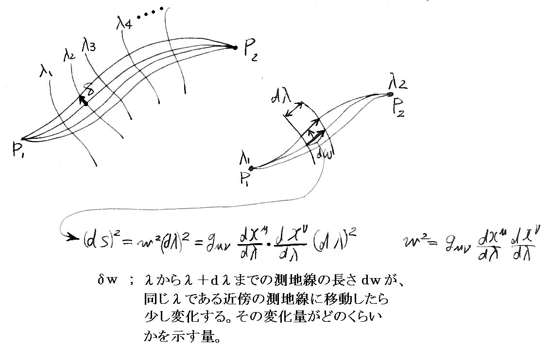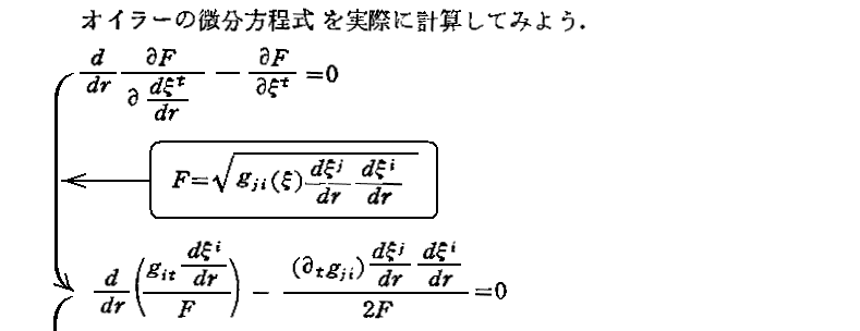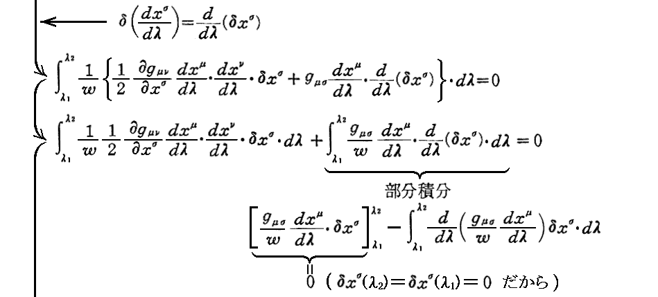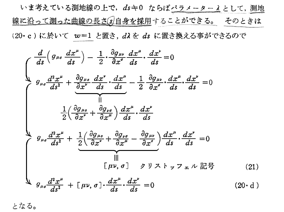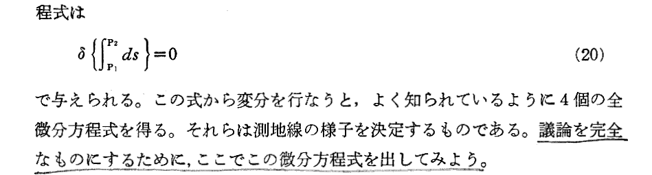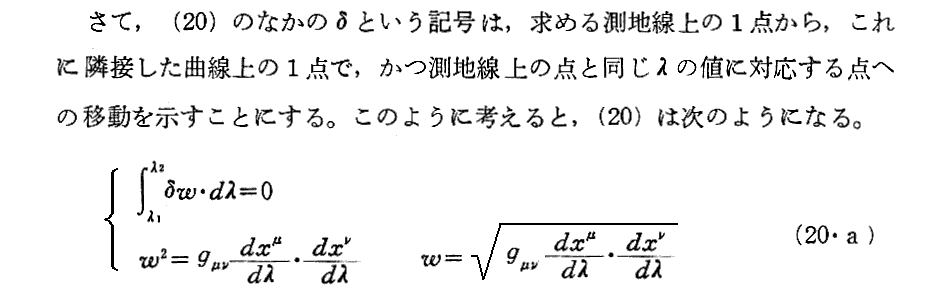 他の著者の測地線方程式導出の説明を幾つか引用しておきます。