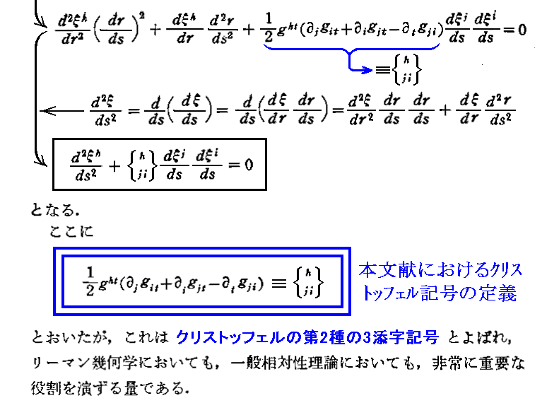 クリストッフェル記号の表記法については別稿6.(2)[補足説明1]を参照されたし。また、この記号の意味については別稿「基底ベクトル・双対基底ベクトルと反変成分・共変成分(計量テンソル・クリストッフェル記号・共変微分とは何か)」4.(4)を参照されたし。そこで説明する様に {クリストッフェルの3添字記号}=0 は、空間が曲がっていないことを意味する。