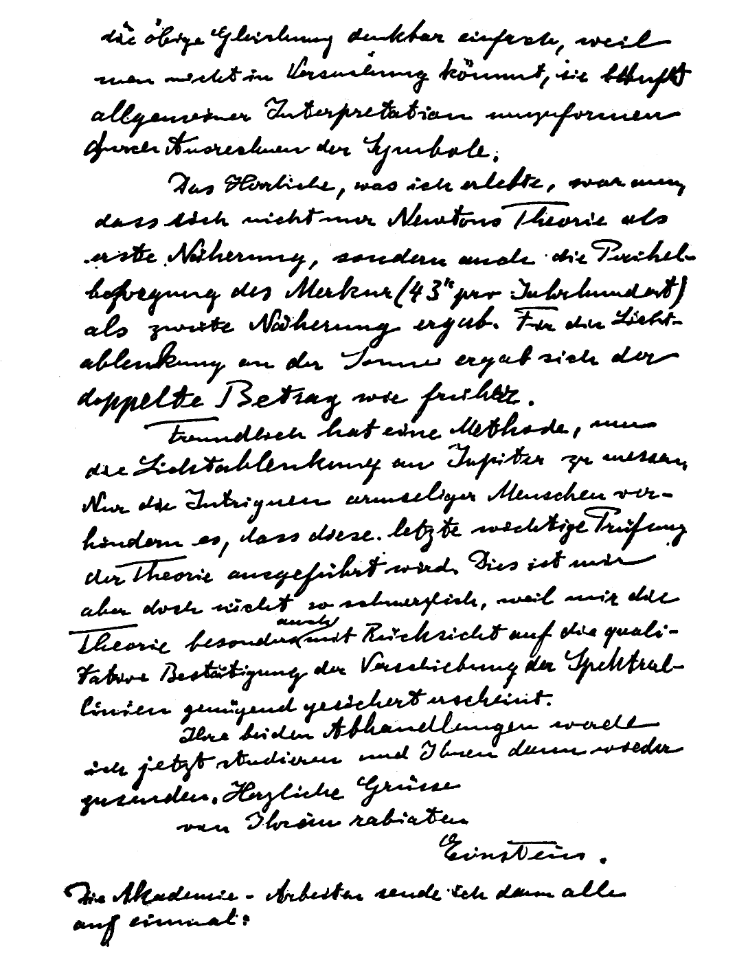 手紙の文末に上げている古典的検証の太陽光での光線の振れを確認する最初の試みとして、ジョージ・ヘイル宛書簡を参照。