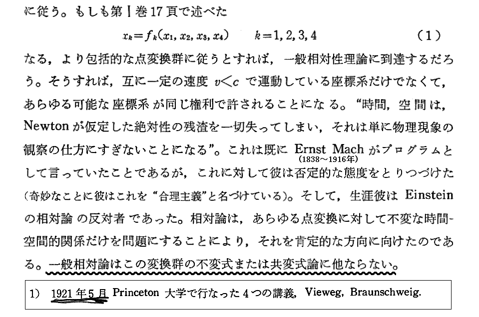 上記注1)の4つの講義は、Einstein著(矢野健太郎 訳)「相対論の意味」岩波書店(1958年刊)に収録されている。これは含蓄深いが故に、また説明が簡潔であるが故に極めて難解です。そのため一般相対性理論を理解してから読んだほうが良いと思います。ただし第3回講義の前半はあらかじめ読む価値がありますので別稿で引用しています。