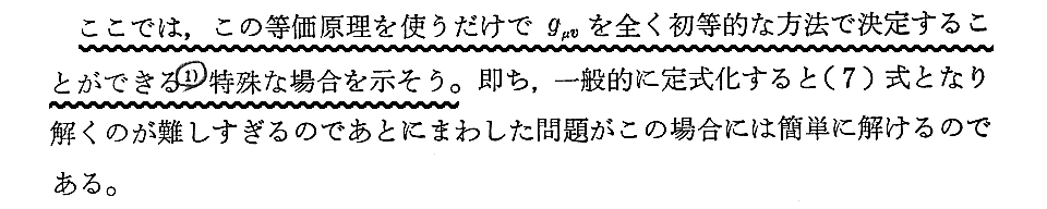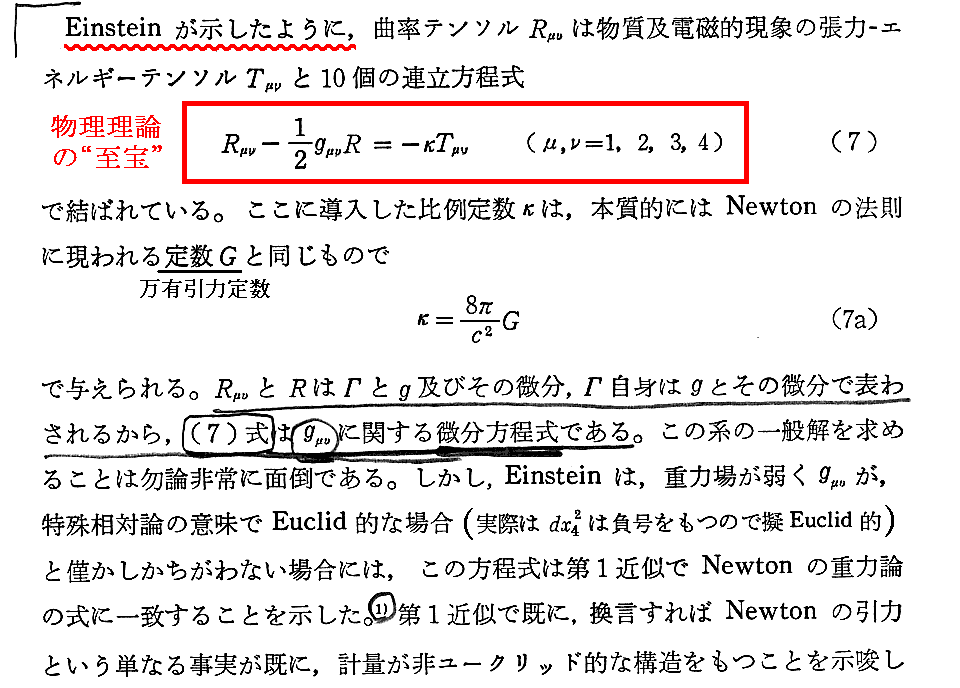 アインシュタインの一般相対性理論の中心法則が次の(7)式なのですが、アインシュタインがそれを発見した過程を読者に説明するのは極めて難しいので、そこの所は残念ながらすべて省略するということです。