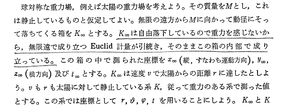 そのとき光の慣性質量と重力質量は等価なのですから、その屈曲する量は太陽の質量と光りが通過する太陽からの距離にのみ依存して、光がどのような質量を持っているかどうかには関係しません。いずれにしても、その屈曲量はSoldnerが計算していた値となります。そのとき時空は全く曲がっていません。