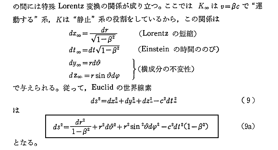 SommerfeldがW.Lenzの助言に従ったと書いている、(9a)式から(12)式を導くやり方は教育的です。これは多くの入門書で説明されている二次元時空についての説明を球座標時空に拡張したようなやり方です。(W.Lenzとは、かってSommerfeldの助手を務めていたWilhelm Lenzのことだろう。彼の名前は『Einstein-Sommerfeld往復書簡』にも出てきます。)