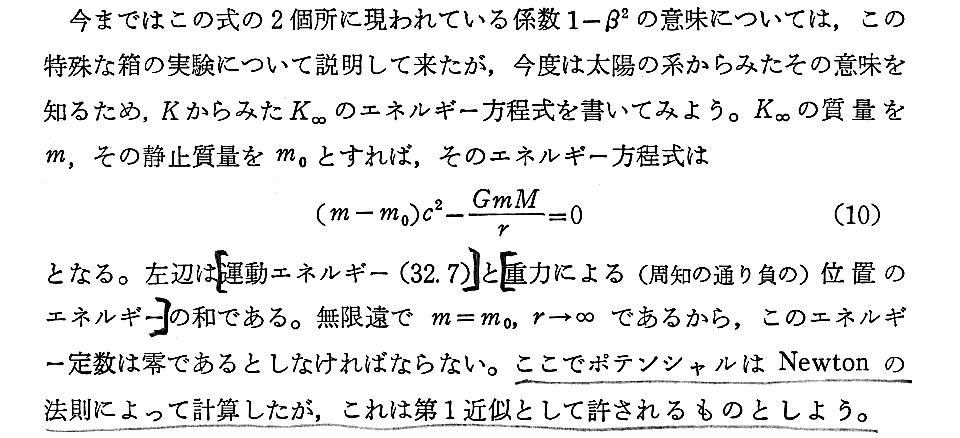 だから上記の意味するところは重力場が無視できる位置にいる観測者が重力場中の光子を見ることができたらその光子は(31a)式に従ってゆっくり進んでいる様に見えると言うことです。現実にその様子を見ることはできませんが、その事を測定する事はできます。その事については別稿3-5シャピロの実験をご覧下さい。