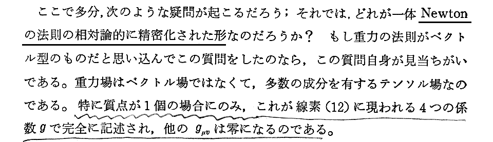 文中の“(7)式はgμνに関する微分方程式である。”について補足します。重力場方程式(7)を解くと言うことは、計量テンソルgμνを(7)式の左辺に代入して計算したら(7)式を満足するような計量テンソルgμνを求めると言うことです。