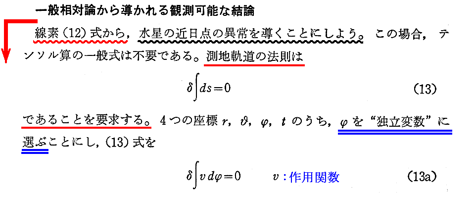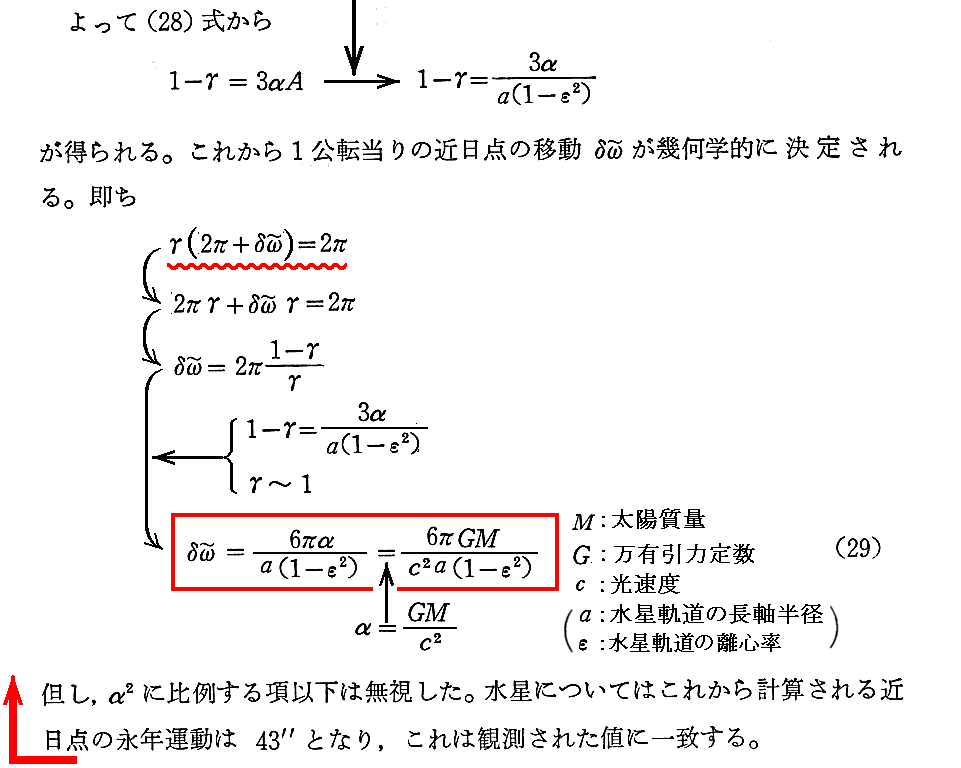 上記(29)式は、Einsteinが“重力場方程式”(7)式を導く過程を進んでいた一連の4つの論文中の第3論文で導かれた。一般相対性理論の応用の中でも特に有名な式です。