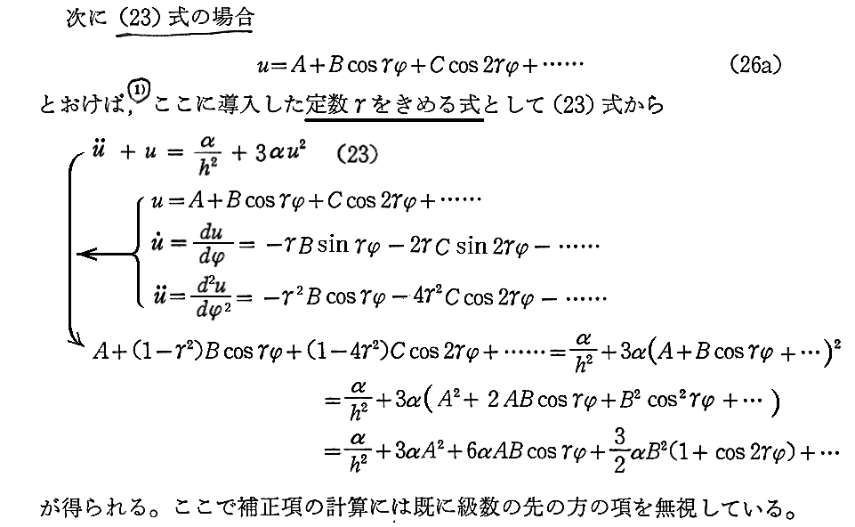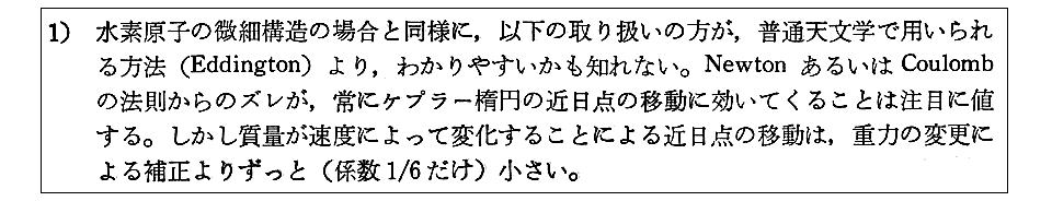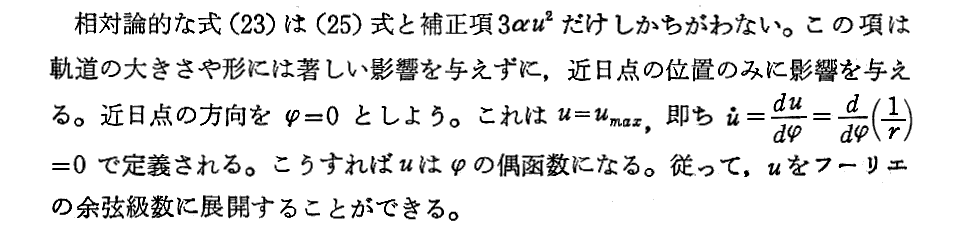 Newton理論(25)式の導出は別稿「楕円軌道の発見と万有引力の法則」5.(3)1.などを復習されたし。さらに(23)式と(25)式の差分については、ランダウ・リフシュツ共著「力学」§15“ケプラー問題”の章末問題3.など参照されたし。