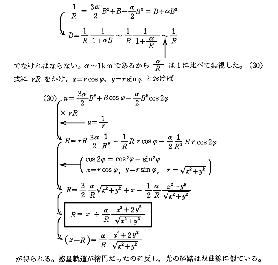太陽表面をすれすれに進む光線の場合、R=太陽半径となり、α=1.32kmですから、α/R=1.32km/7×105km〜10-6程度の値になります。