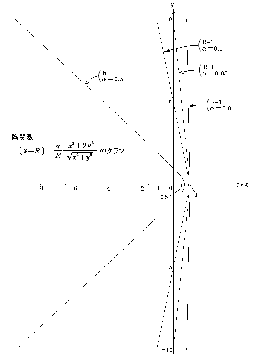 上記の陰関数のグラフは下図の様になります。双曲線に似てはいますがそれとは少し違います。グラフは、Rをすべて同じ 1 にして、αを 0.5,0.1.0.05,0.01 と変えた場合です。