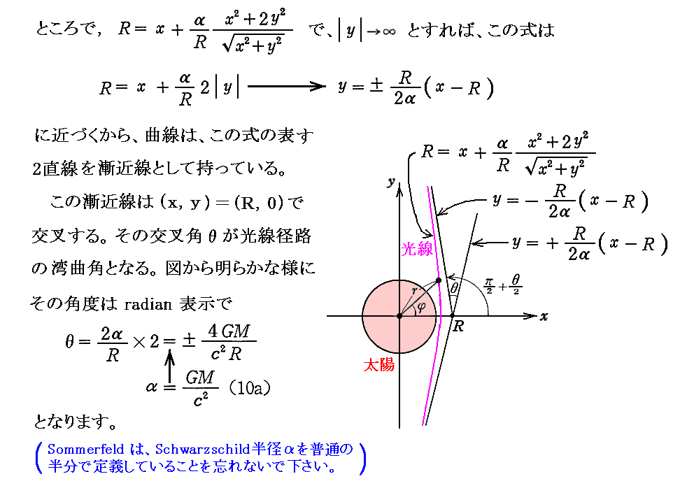 注2)のEddingtonの著書“The mathematical Theory of Relativity”(1923年)はpdfファイルとして無料ダウンロードできるサイトがネット上にあります。上記文中で説明されている証明はV§38で、下記の計算はV§39〜§42で成されていますので参照されて下さい。Sommerfeldはこの文献を参考にして以下の段落を書いている様です。