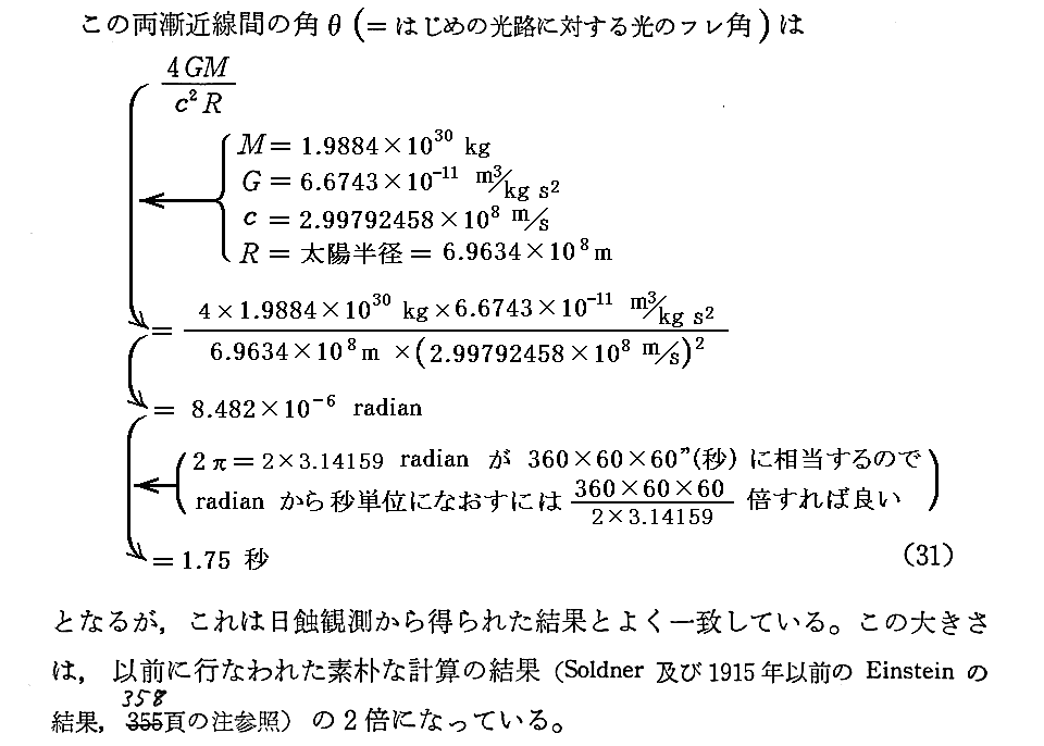 文中の“以前に行われた素朴な計算の結果の2倍になっている。”について補足します。1905年の特殊相対性理論はエネルギーは質量(慣性質量)と等価である事を示した。そして、更に等価原理により慣性質量は重力質量でもある。すなわちエネルギーを運ぶ光が重力質量を持っているのなら太陽からの重力によりその進路が屈曲するのはニュートンの古典的重力理論によって導けます。光がエネルギーを持つことが質量を持つことであるところに特殊相対性理論が関わりますが、それ以外は平坦な時空を仮定しているニュートンの万有引力の法則ですべて説明できます。