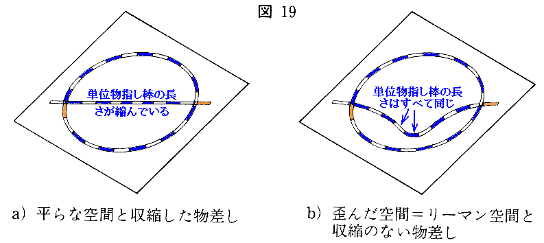 現実に重力場の中を進んでいる光にとって、その周囲に配置されている物指棒が縮んでおり、時計がゆっくり進んでいることを知ることはできませんから、光はあくまで真っ直ぐに進んでいると思っている事でしょう。これが測地線に沿った軌道であり最短距離を進む軌道であり、b)の立場 による説明です。