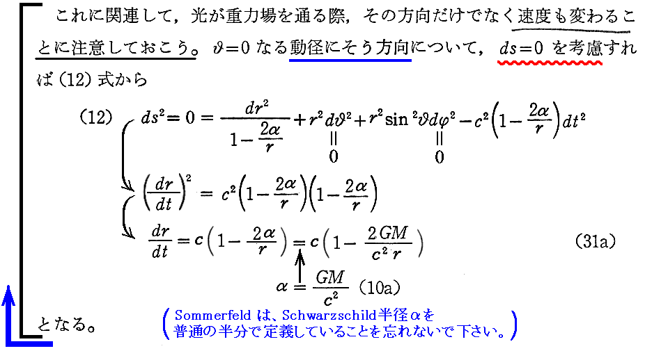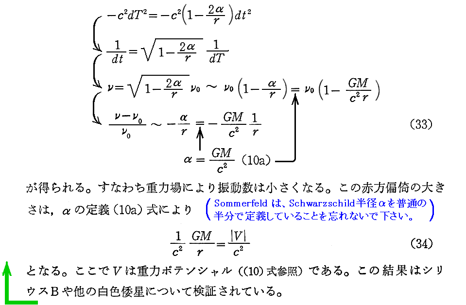 3−1で注意したように、重力場の中であろうと重力場の外であろうと《光速度は一定不変》です。だから恒星表面からやってくる光の振動数は恒星表面での振動数をそのはまま保持しています。そのことをSommerfeldは“計算せずに理解することができる”という言い方で説明している。