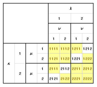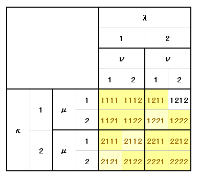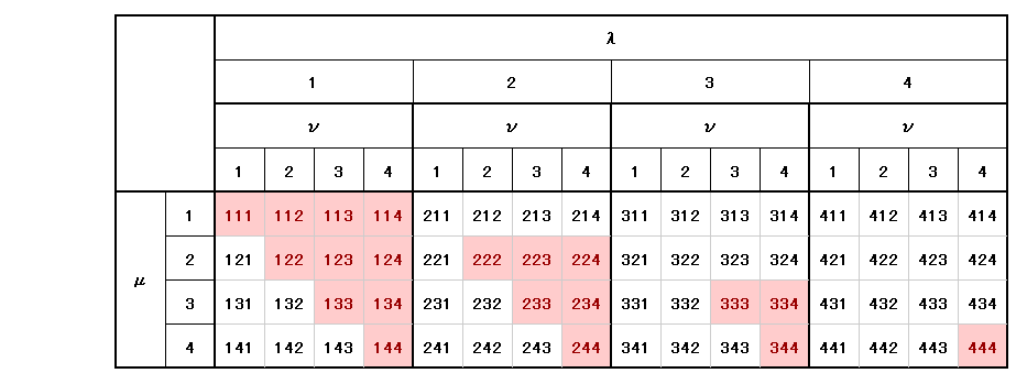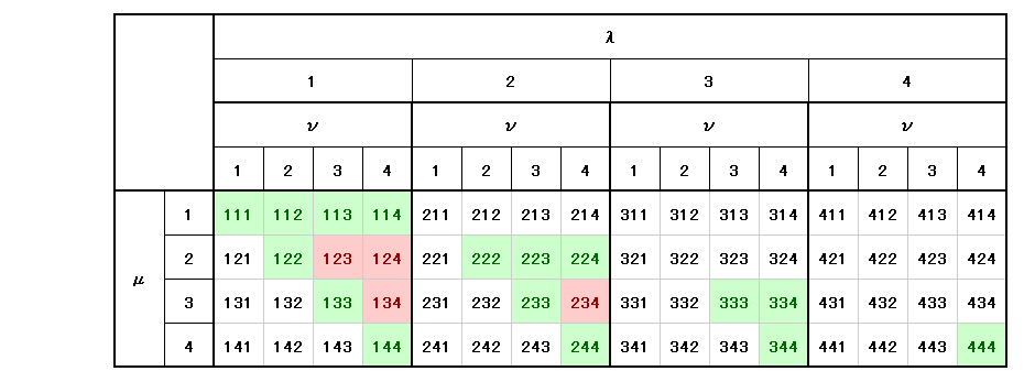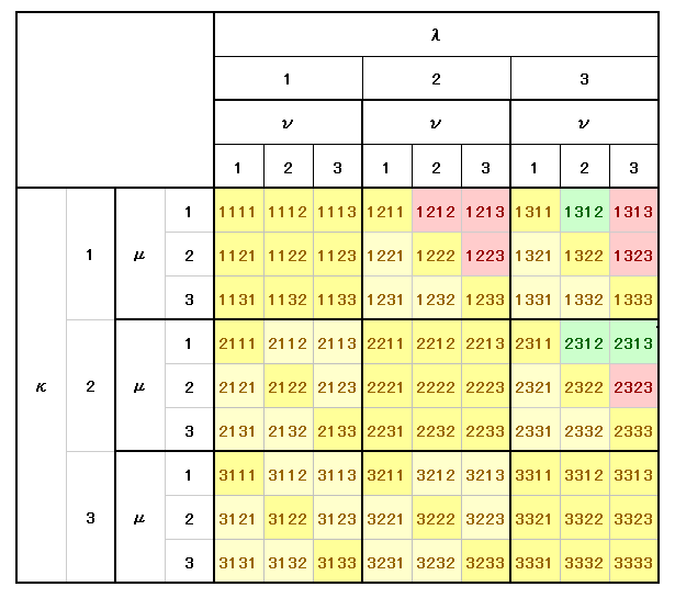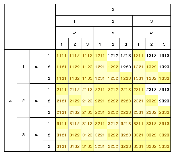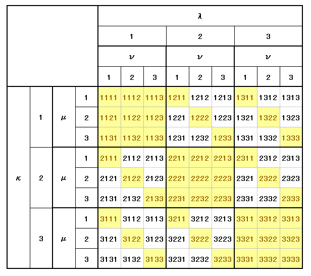 この場合も同様に、添字の値が左から λ≦μ≦ν に成るように左上隅から順に選んでいけば良い。