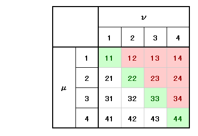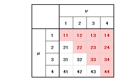 この場合も同様に添字の値が左から μ≦ν に成るように左上隅から順に選んでいけば良い。