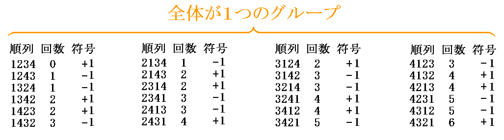 これは4個の異なる数字から同じものを選ぶこと無く4個を選ぶ組み合わせの数 4C4=4×3×2×1÷(4!)=1と一致します。これが[補足説明]で説明するグループの数です。