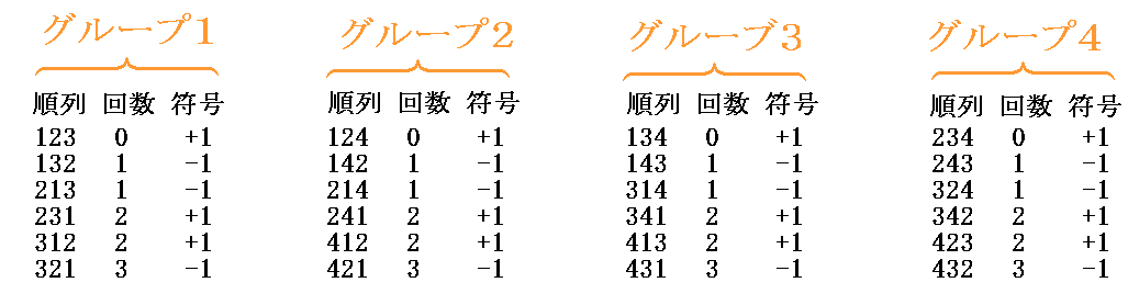 結局、この“完全反対称相対テンソル”の独立な成分は上記着色セルの中の1あるいは−1の1個だけです。これはグループの数と同じです。