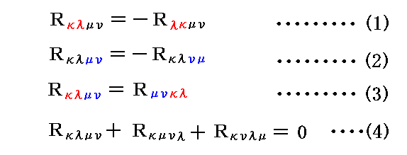 (1)は最初の二つの添字κとλの入れ替えに対して反対称であることを、(2)は後の二つの添字μとνの入れ替えに対して反対称であることを示している。また、(3)は最初の二つの添字κλと後の二つの添字μνをセットで入れ替えた場合には対称である事を示してる。さらに(4)は最初の添字κを固定して、残り3つの添字λμνをサイクリックに入れ替えた3成分要素の和は 0 となることを示している。