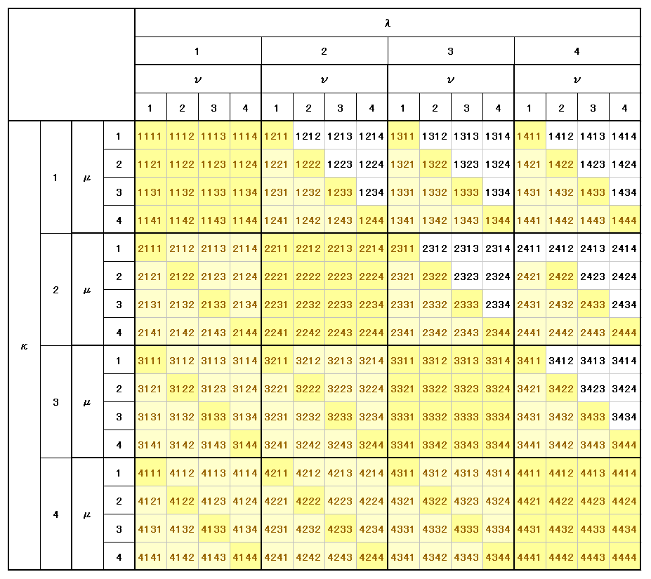 まず(1)の最初の二つの添字の入れ替えに対する反対称性からκ=λの成分はすべて0とならねばならないので独立なものから除かれます。また(2)の後二つの添字の入れ替えに対する反対称性からμ=νの成分もすべて 0 となります。これらの 0 となる成分が下図の黄土色着色部分(112個)です。