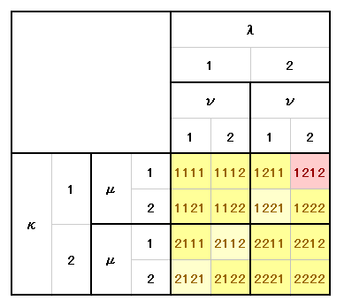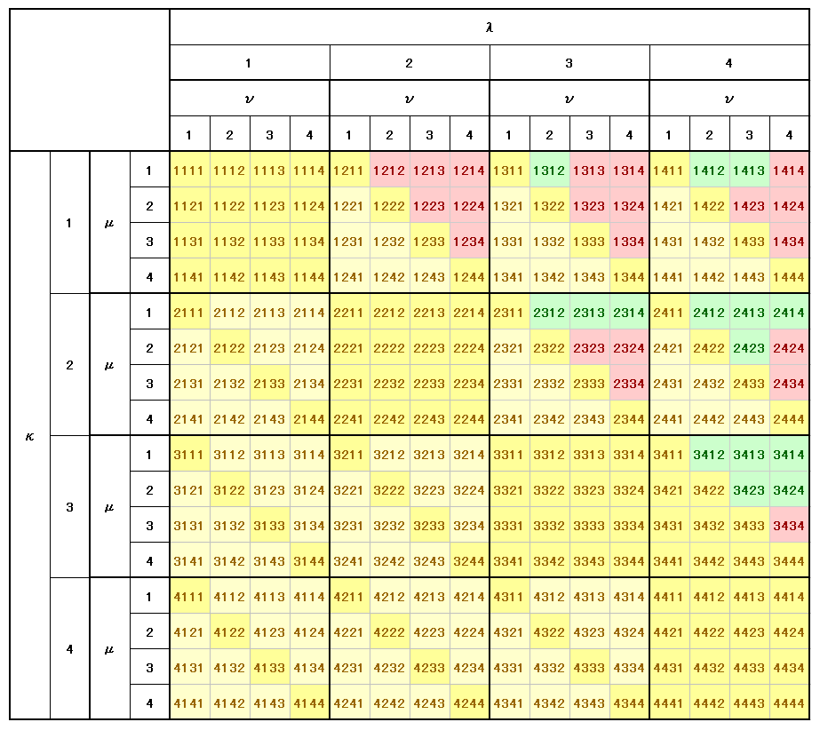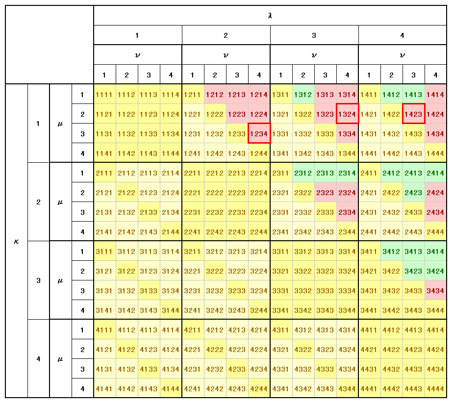 上図ピンク着色セルの中で、下図の赤線□で囲った3つが4種の指数の数字がすべて異なる成分です。つまりR1234、R1324、R1423の3成分です。所でR1324は(2)の性質により−R1342と見なしても良い。