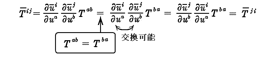 例えば、2階反変対象テンソル Tij の対称性は座標変換しても保たれることが以下のようにして証明できる。