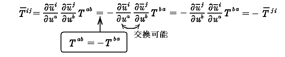 任意階数の共変・反変・混合テンソルでも、対称性・反対称性が座標変換に対して不変である事が同様にして証明できます。