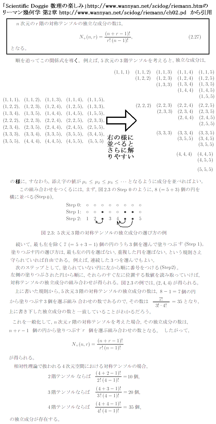 が成り立つとき、そのテンソルを“完全対称テンソル”という。この場合の独立成分の数を階数ごとに調べる。