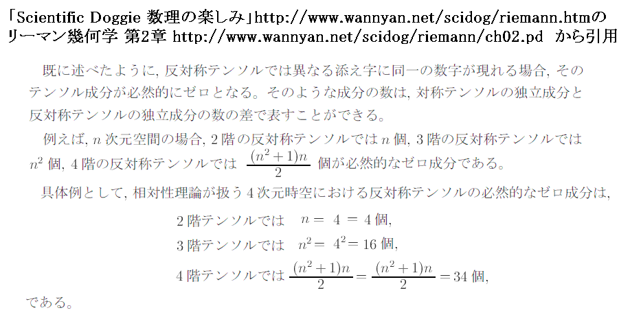 また、2階テンソルの場合、この数は対角成分を除いた成分の数の半分を計算する式、 [テンソルの次元]×([テンソルの次元]−1)÷2 で簡単に計算できます。実際2階4次元反対称テンソルの場合は 4×(4−1)÷2=6 となります。