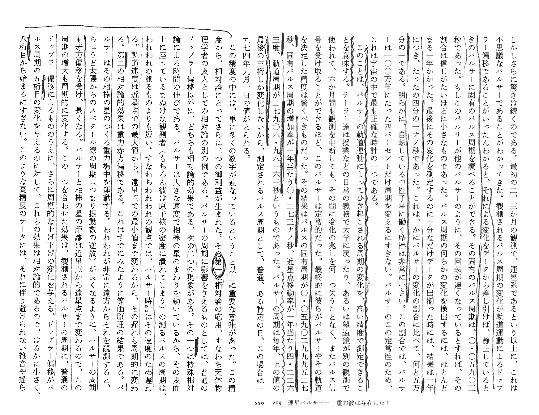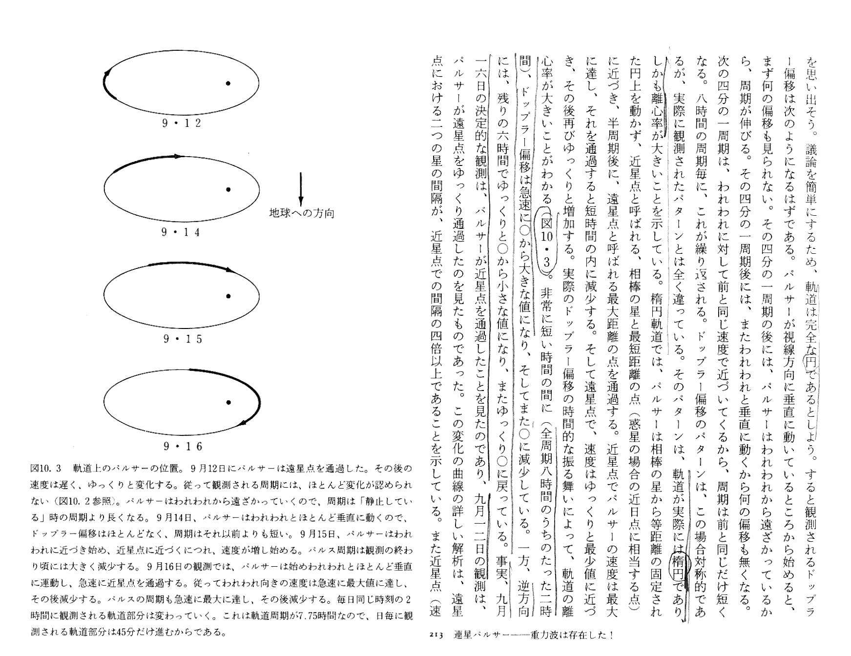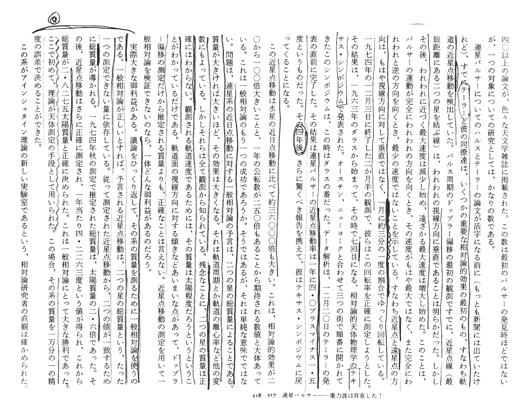本稿引用のC・M・ウィル文献が書かれた時(1986年)以降の連星パルサーの新た発見と、連星パルサーを用いた天文学理論の発展については下記文献を参照されたし。