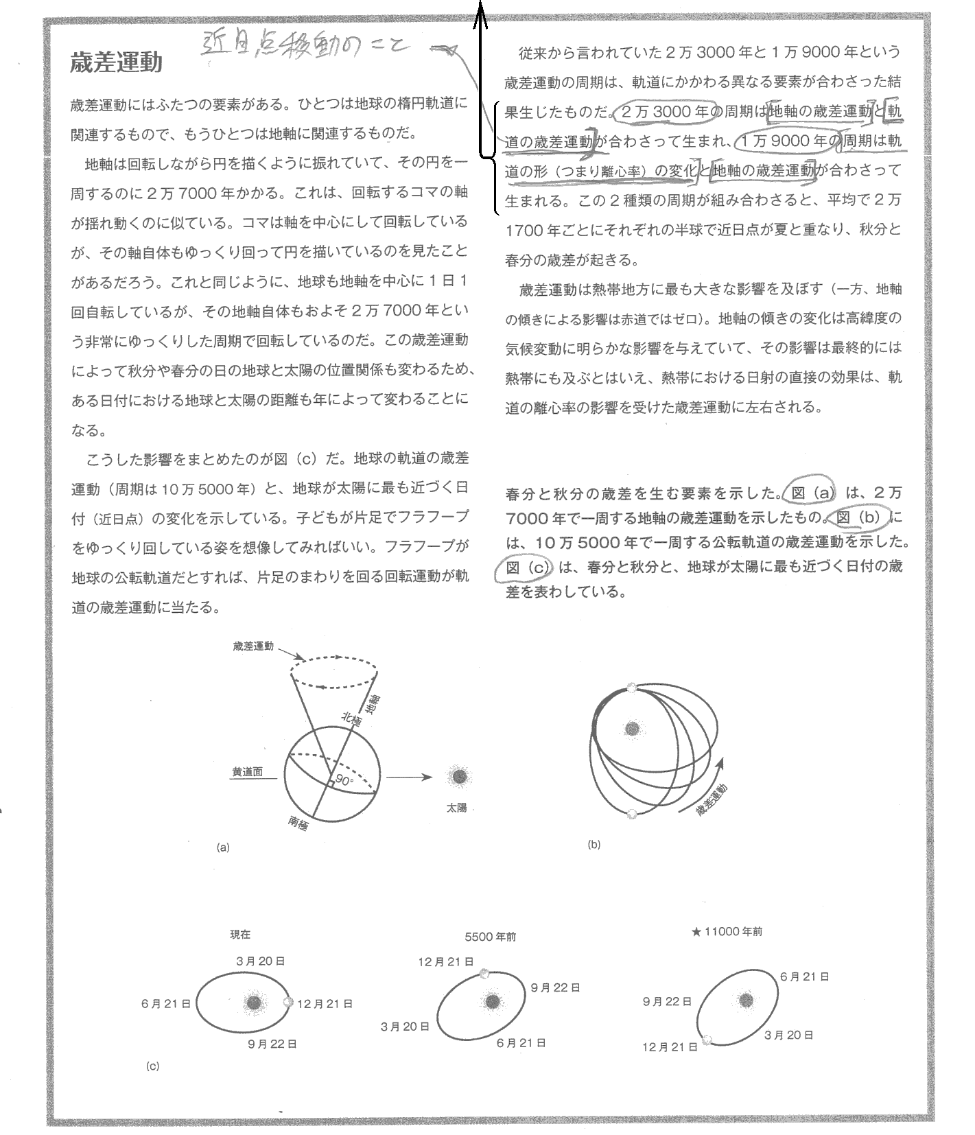 ここの説明は正しくありません。別稿の説明の様に近日点移動との関係で27000年の歳差周期が21000年程度に縮まります。そのとき、離心率も変動しますので、それが原因で21000年の前後に少しブレると言うことです。だから過去に遡るとこの離心率の変動によるブレは様々な周期を生み出します。23000年と19000年の二つに限ると言うわけでは有りません。