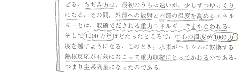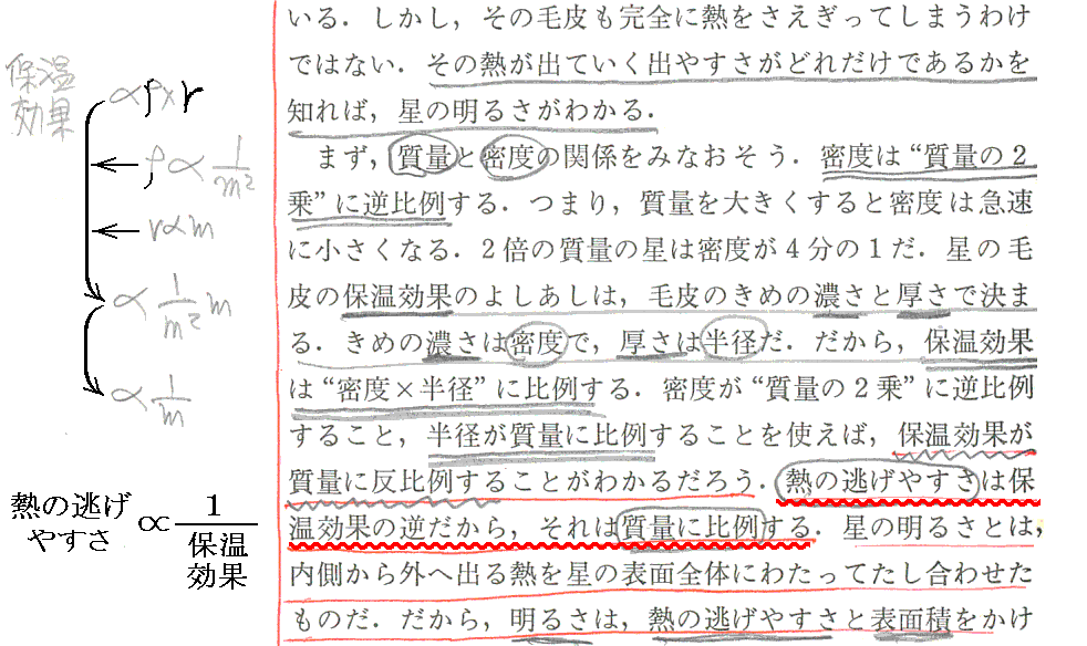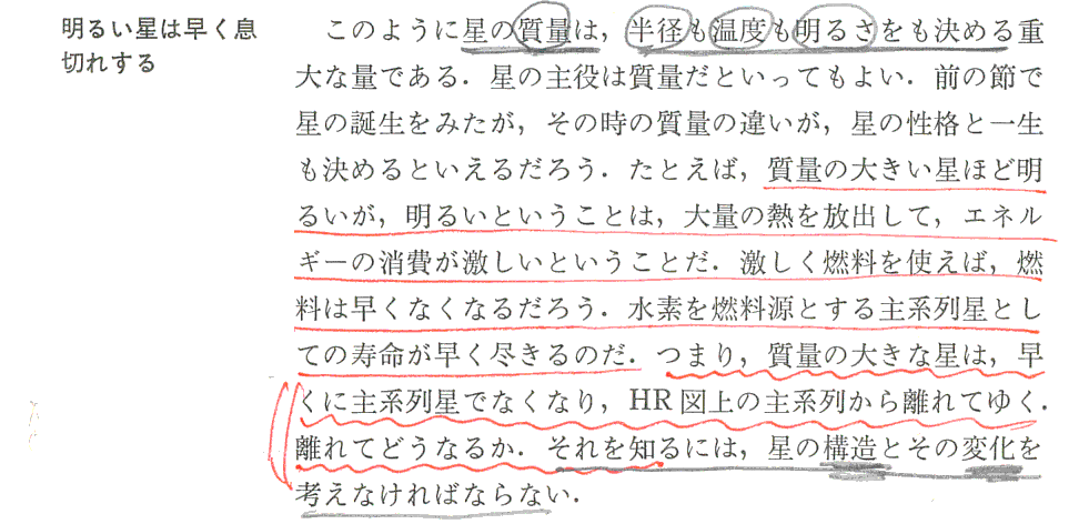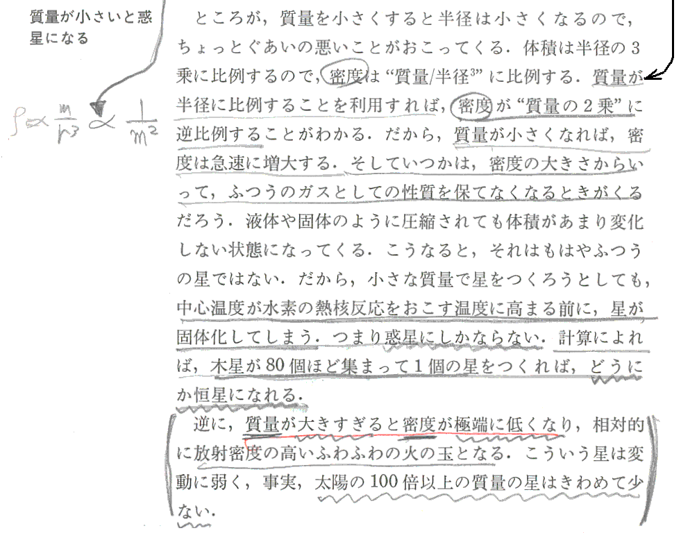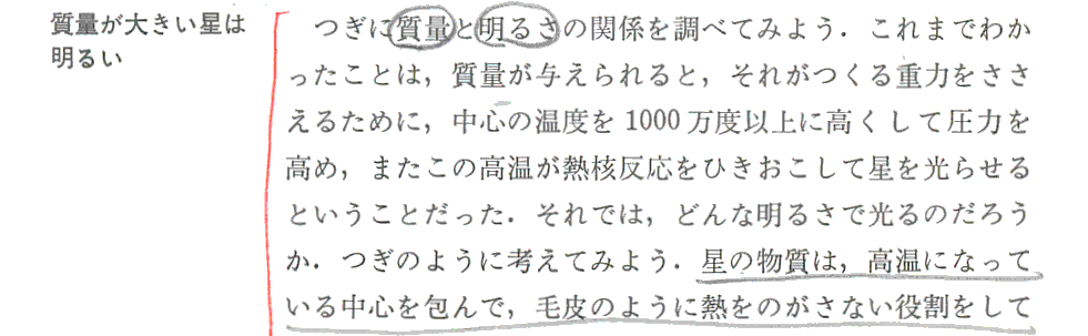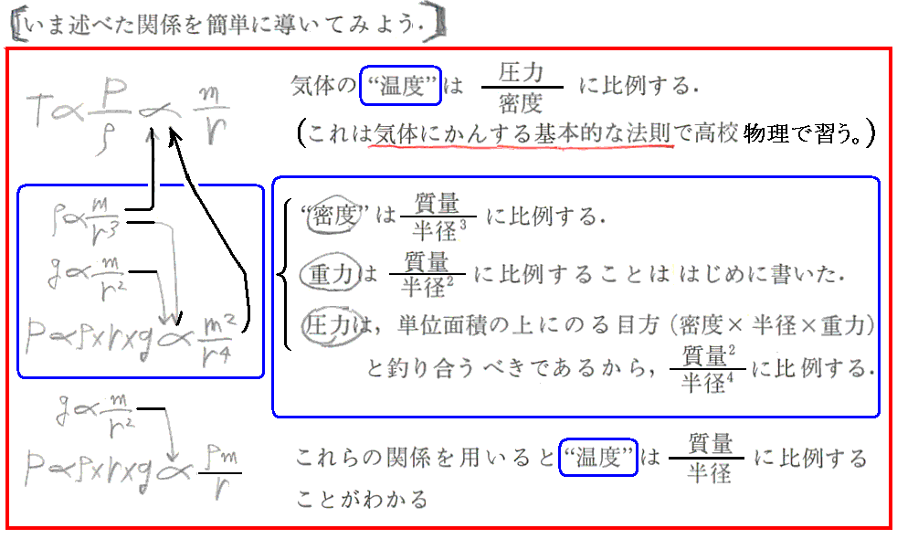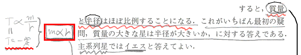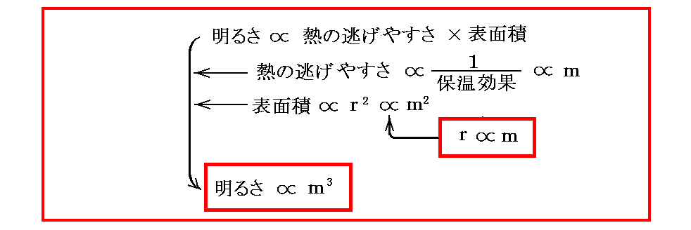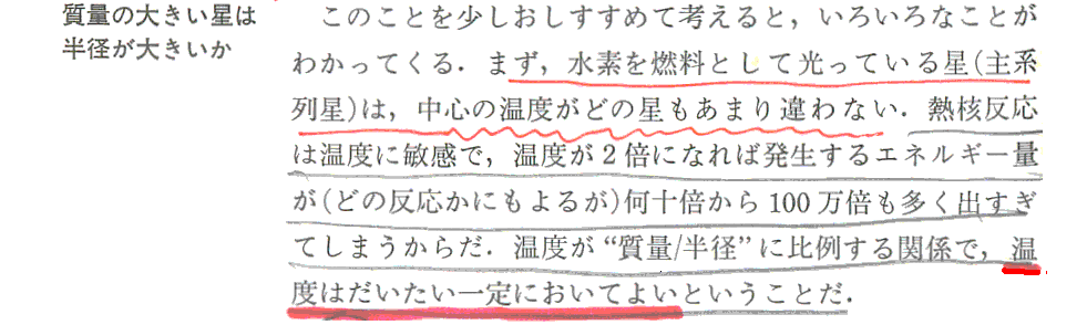 つまり、“主系列星の中心温度は大体同じ”である事が、主系列星の星の大きさは半径に比例する事を決める。