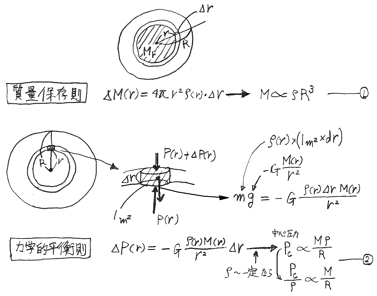 すなわち、ガス圧が優勢な場合(半径が太陽半径の5倍以内の星)気体の状態方程式が成り立っていると言うことです。星の大きさが更に大きくなるとガス圧よりも輻射圧が優勢になり、以下の議論は修正が必要になります。
