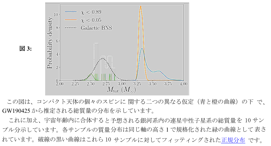 図3は、宇宙年齢内に合体すると予想される銀河系内の連星中性子星系の総質量を10サン プル示しています。図内の正規分布はこれらのサンプルに対してフィッティングされ、平均質量は太陽質量の