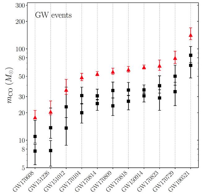LIGOとVirgoがこれまでに観測した連星ブラックホールの質量をGW190521(一番右)と比較したグラフ。黒い四角が合体前のブラックホールの質量、赤い三角形は合体後のブラックホールの質量をそれぞれ示す。縦方向の線は予想される質量の誤差範囲を示す(単位M?は太陽質量)(提供:LIGO