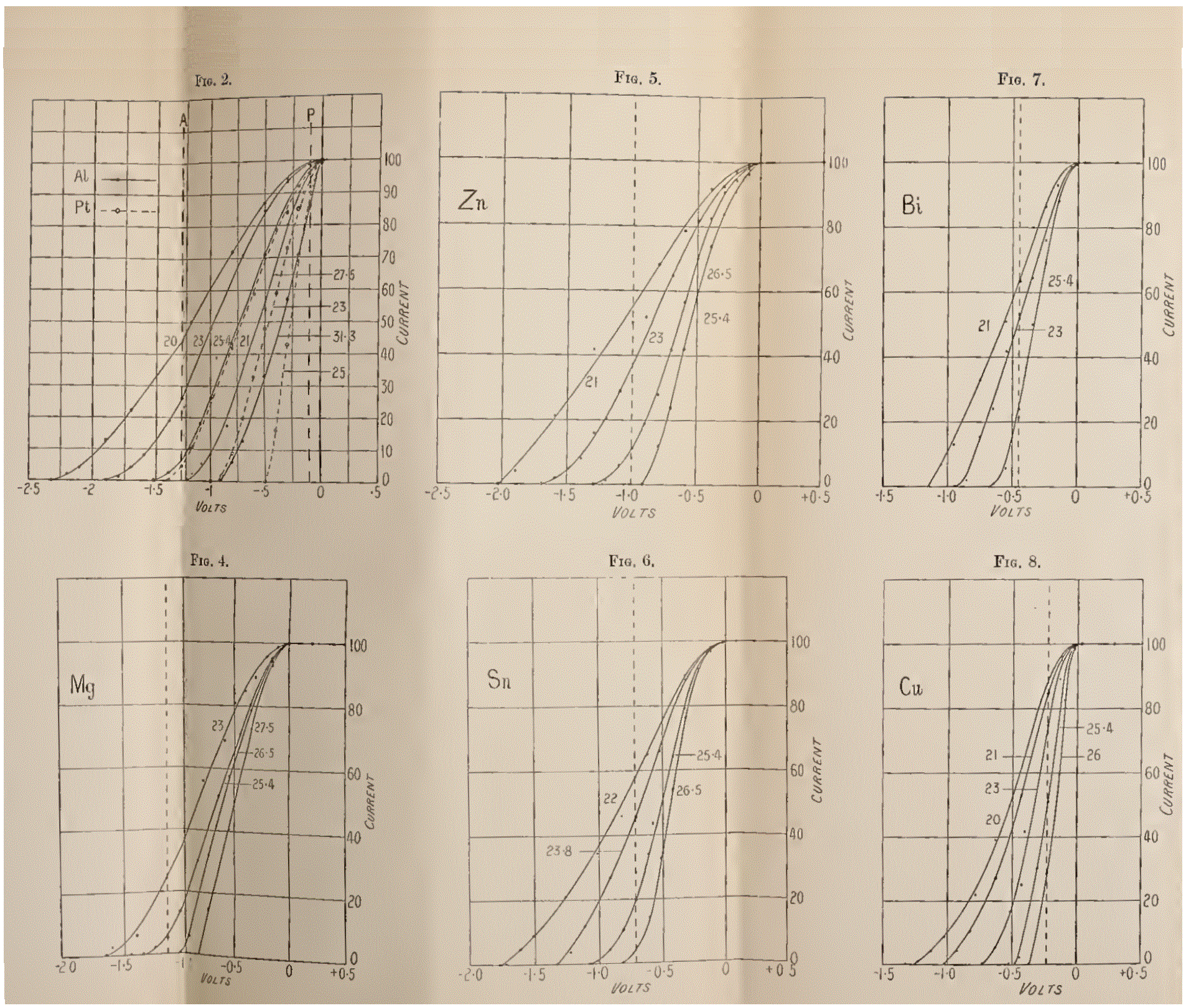 これは、受光電極を構成する金属の“接触電位”によるものなのですが、問題なのは、受光電極の金属の種類により接触電位はそれぞれ異なるために、上図の電流値が減少を始める開始電位V0がバラバラになる事です。つまり接触電位の違い(つまり金属の違いにより)により、曲線全体を左右に移動することになる。