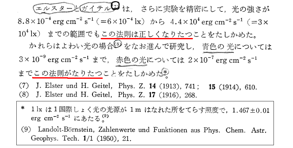 アインシュシタインが1905年の光量子説論文の中で1902年のレーナルト論文を度々引用しているため、レーナルトの業績が過大に取り上げられて重要視されますが、アインシュタインが光量子仮説を提出した1905年当時の状況は[補足説明1]で説明した様に、光電効果実験における 臨界電圧値Vmin や 飽和電流値 Imax と 光の波長との関係、金属種類の違いとの関係、光の照射強度との関係、等々・・・の実験結果は混沌とした状態にあったのです。