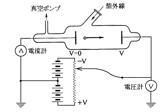 二つの相対する電極を置き、一方に光を当て放射される電子が対板電極に達することによって生ずる電流を測定する。二つの極板の間に電子を加速する向き、あるいは逆に減速する向きに電圧をかけ、この電電圧 V と電流との関係を見る。