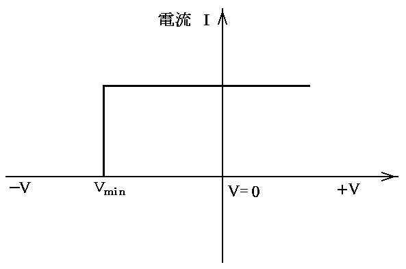 すなわち、対面電極にかけた電圧がある大きさVminに達しない内は電流は電圧に依存しない一定値となるが、V=Vminまで電圧が下がったところで電流はたちまち0まで減少する。