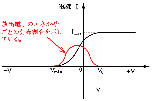 一般にVなる電位差のときに (1/2)mv2>e・Vなる電子のみが対板に達するのですから、電流とVの関係より放射電子の最高エネルギー値を知ることができます。