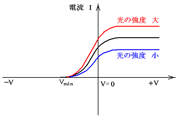 さらに、もう一つ困っるのは電流値の減衰がV=0から始まるのでは無くて、V>0の正の電圧値V0から始まることです。本来、対面電極の電位が正値になれば、受光金属の電極を出た(負の電荷を持つ)光電子はすべて対面電極まで移動するはずです。そのため、照射光強度が一定ならば、その電流値はV>0の部分では、電流値は常に飽和して一定値になるはずです。所が実験事実はV0>0の部分から電流値の減少が始まっていたのです。
