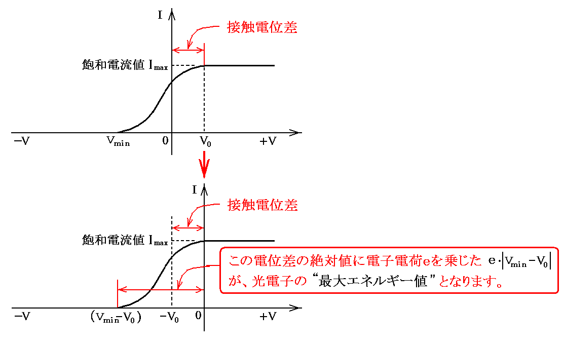 だから、上記の V を用いて計算できる e・V の値が光電子の持ちうる最高の運動エネルギー値であることなります。こうして最高の運動エネルギー値を測定できます。