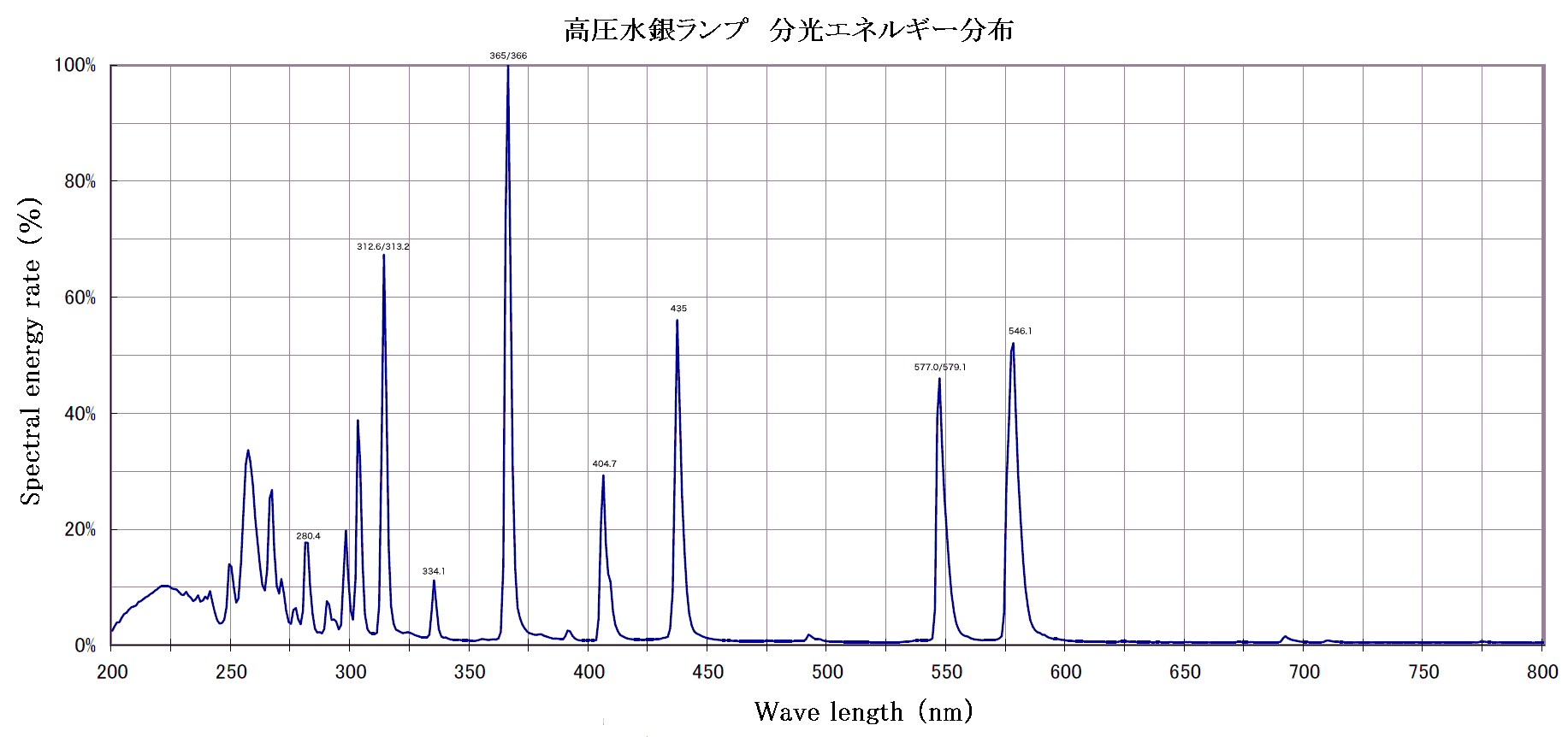 光源として用いられた水銀灯が発する光の波長強度分布は