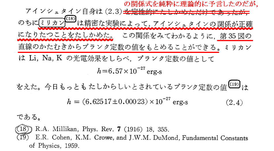 多くの困難を乗り越えて、“アインシュタインの関係式”が極めて正確に成り立つ事をたしかめ、それから極めて正確な“プランク定数”hを求めたMillikanの1914年論文と、1916年論文は別稿で引用していますので、詳細はそちらでご確認下さい。