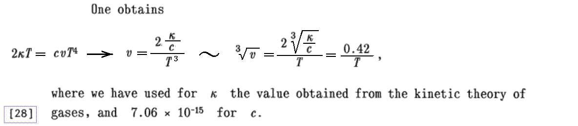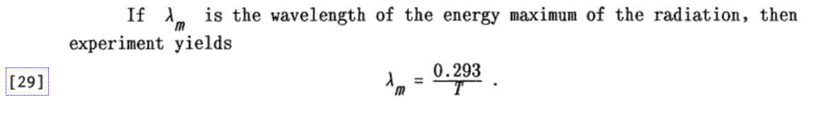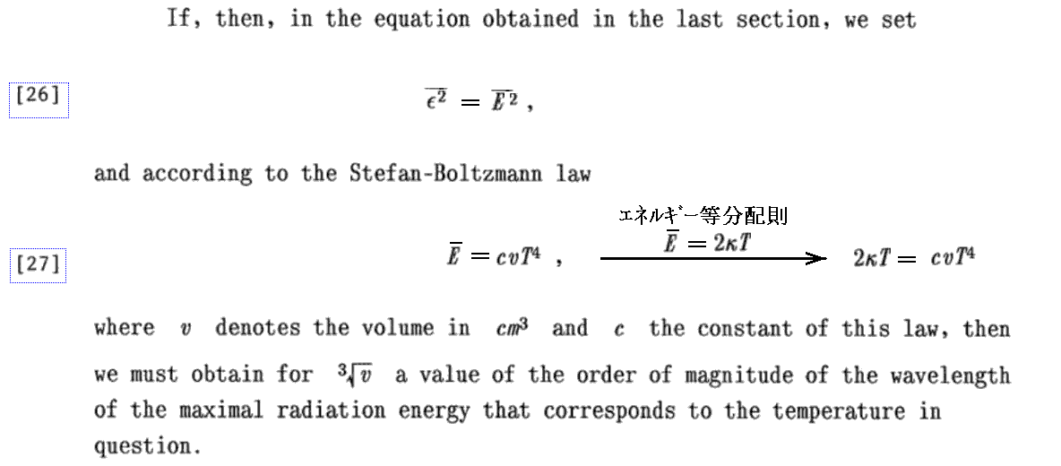 当時の値を用いると、定数cは 7.06×10-16J/m3K4=7.06×10-15erg/cm3K4(別稿「プランクの熱輻射法則」9.(3)で求めたaの値)であり、ボルツマン定数は注[21]で求めている6.5×10-17erg/K を用いている様です。これらから、上記の 0.42が得られます。また、下記のウィーンの変位則の定数 b=0.293cm・K の値も「プランクの熱輻射法則」9.(3)を参照して下さい。