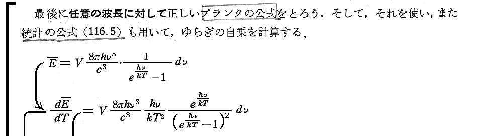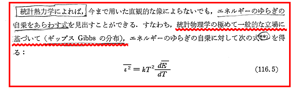 上記でギブスの正準分布を利用すると書いてありますが、(W.12)式を導いたのはEinsteinの統計力学1904年論文の§4が最初でして、Einsteinはギブスのカノニカル分布の統計力学に相当するものを自ら開発していたのです。このことについては江沢文献「統計力学へのアインシュタインの寄与」116_117をご覧下さい。