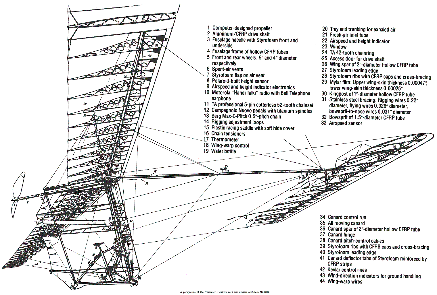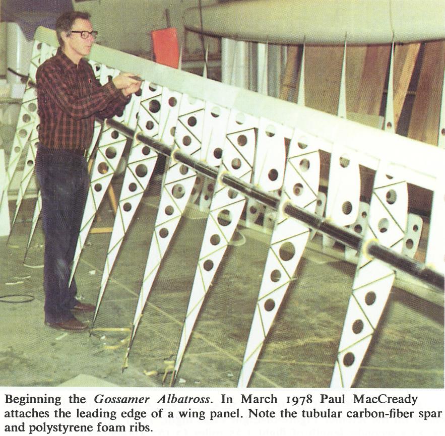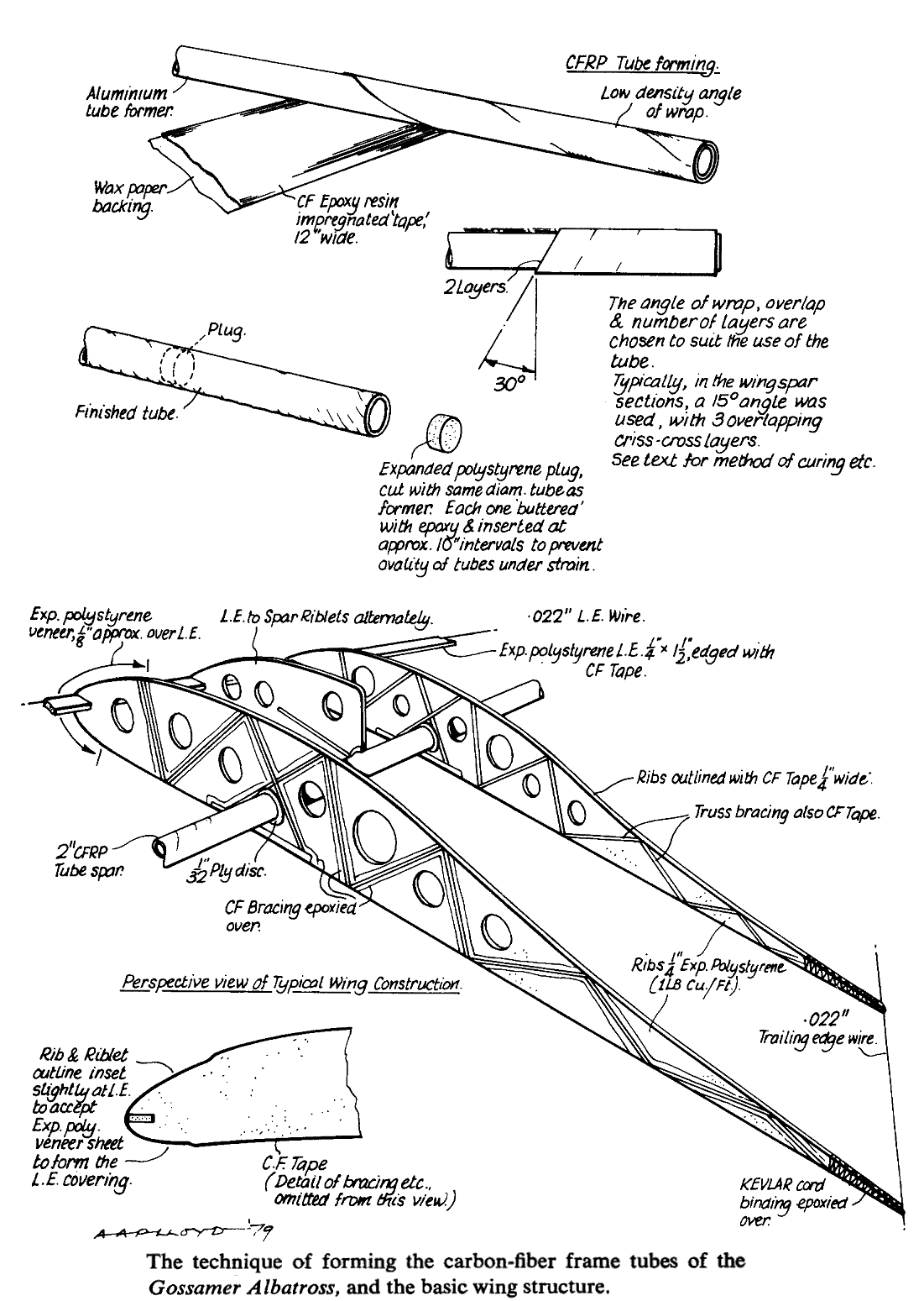 人力飛行機“ゴッサマー・アルバトロス”の翼はカーボンファイバー製のスパー(翼桁)とポリスチレン製のリブから構成されており、翼とコックピットは薄くて丈夫なポリエチレンテレフタレートのフィルムで覆われていた。翼スパン28m、機体質量32kg、翼面荷重2.2kg/m2でした。