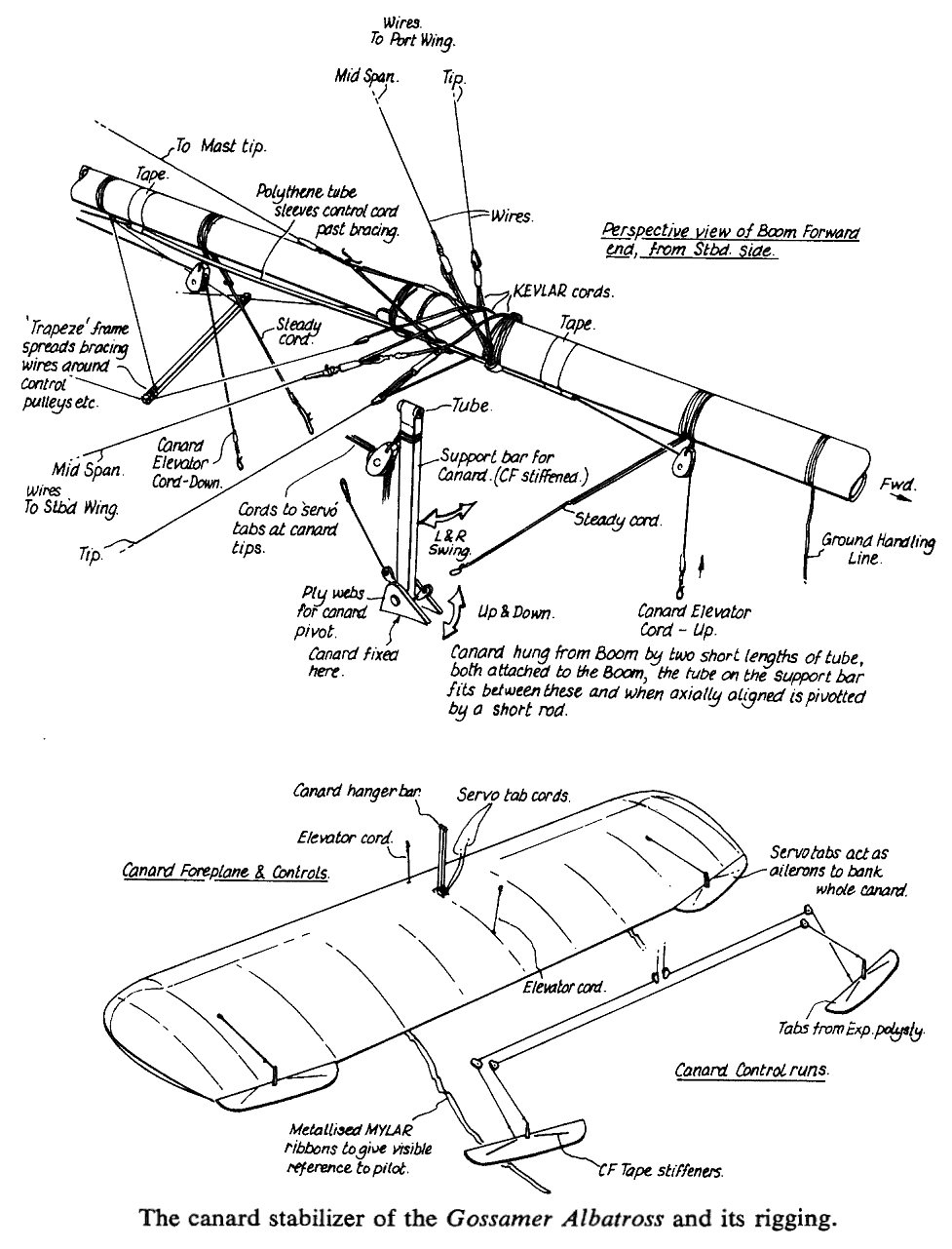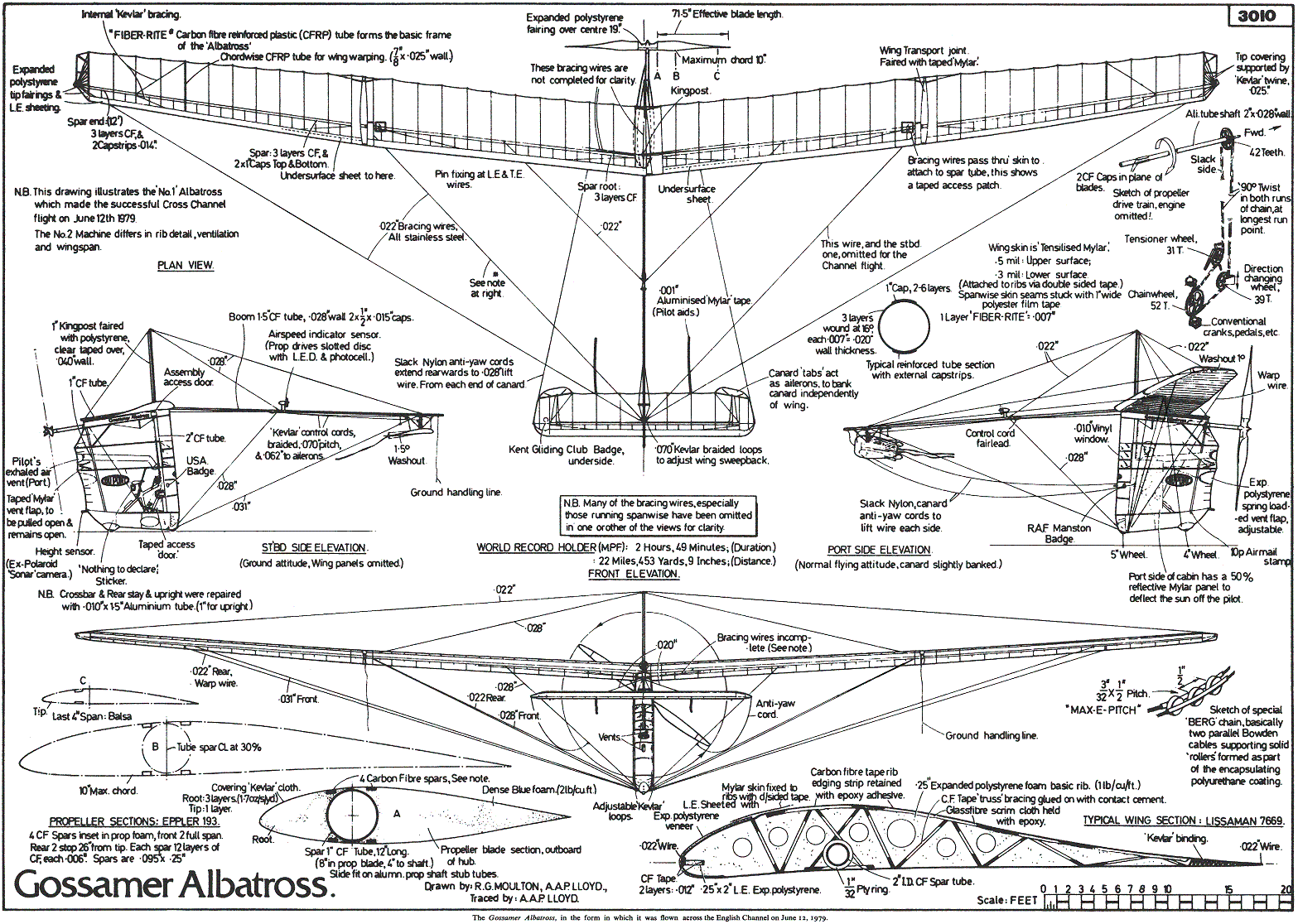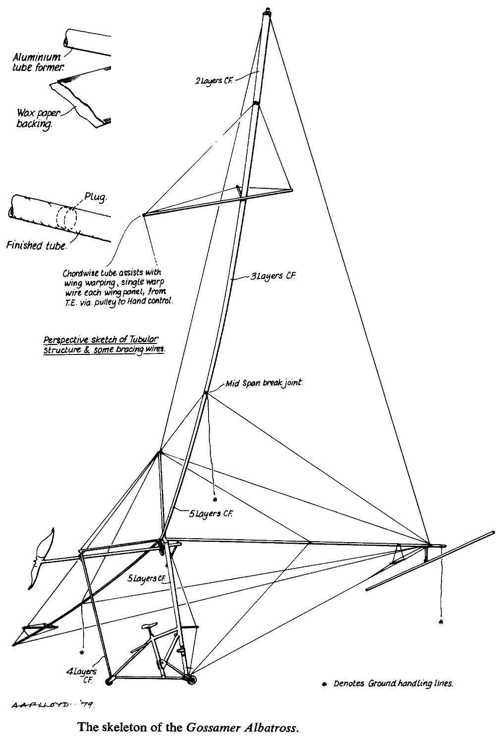 人力飛行機“ゴッサマー・アルバトロス”の翼はカーボンファイバー製のスパー(翼桁)とポリスチレン製のリブから構成されており、翼とコックピットは薄くて丈夫なポリエチレンテレフタレートのフィルムで覆われていた。翼スパン28m、機体質量32kg、翼面荷重2.2kg/m2でした。