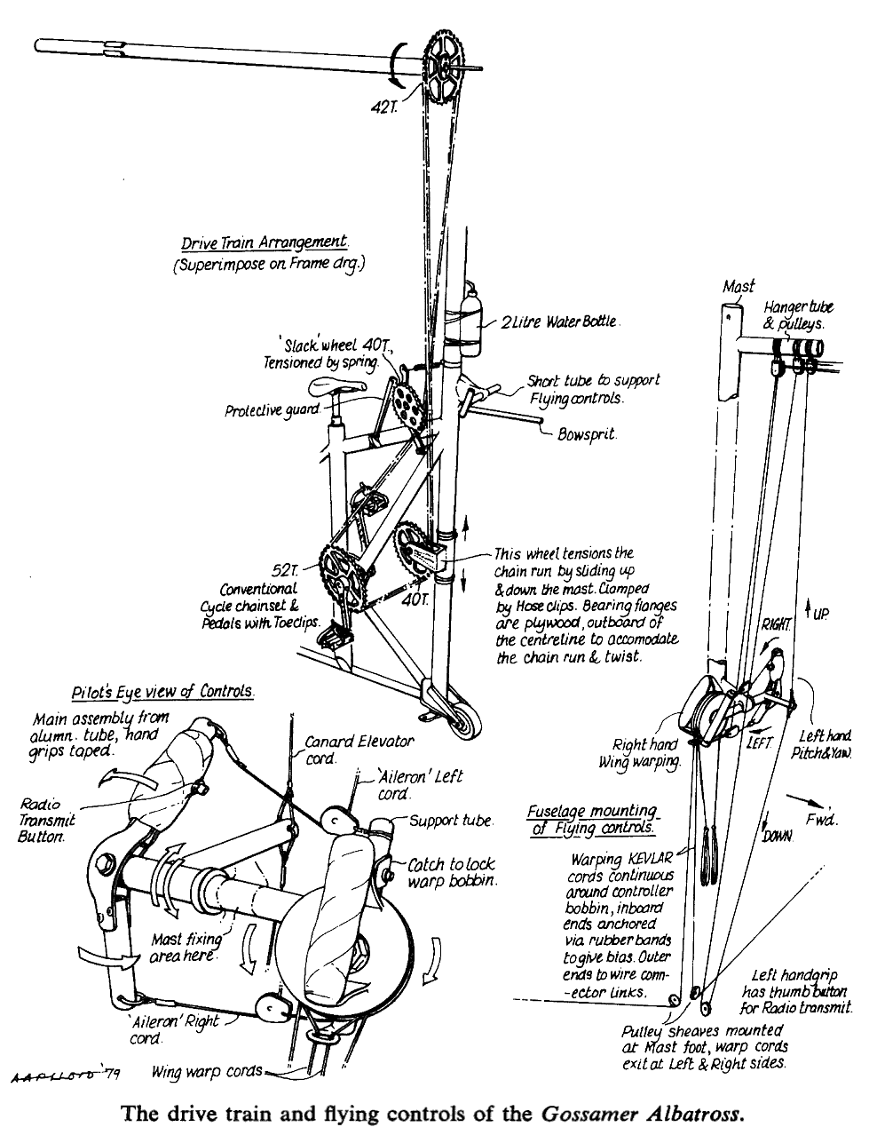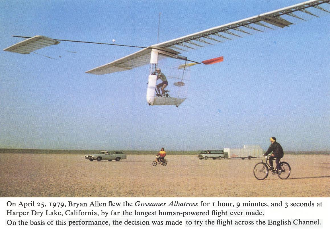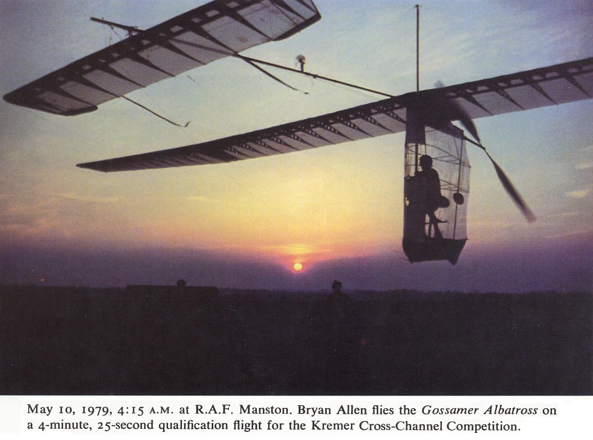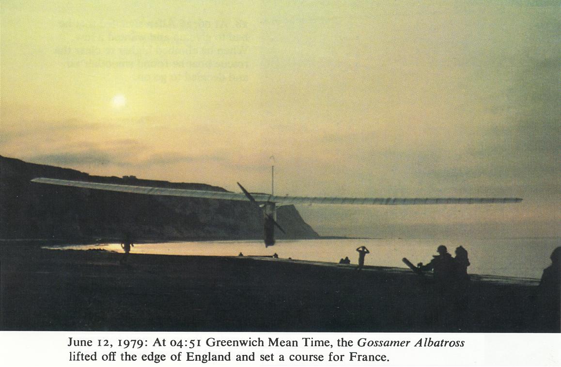 1979年6月12日、アルバトロスは人力出力約0.34馬力で直径4mのプロペラを毎分95回転させ、2時間49分かけて35.81kmを飛びドーバー海峡を横断した。