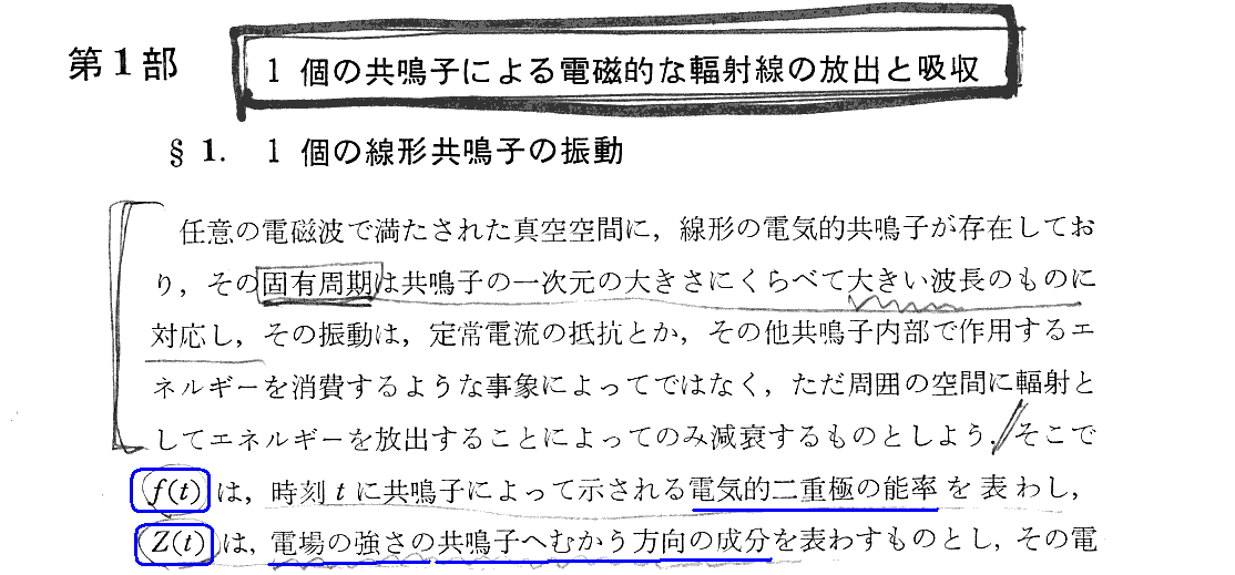 この節の説明は 「調和振動子(自由振動、強制振動、減衰振動、強制減衰振動)」 と 「線型振動子(電気双極子)による電磁波の放出」 を復習されたし。